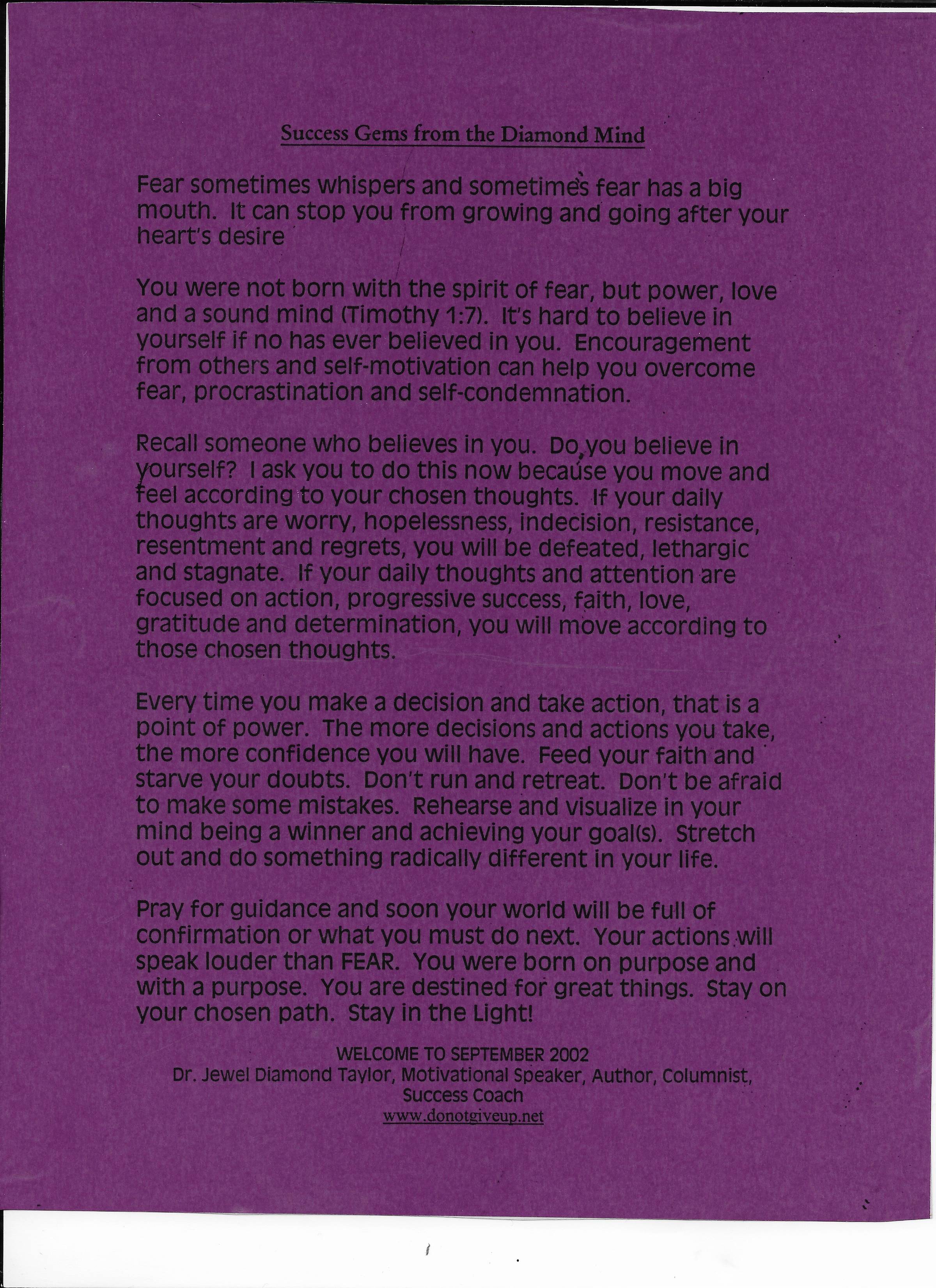 Reader Beloved, It's Friday, Woohoo! I do not know about you but when the week is winding down, so is my energy! I look forward to some quiet time. I also enjoy spending time catching up with family and friends. To get me through the week, I lean on an encouraging Word, daily affirmations, inspirational quotes, and uplifting messages. I particularly enjoy surrounding myself with reminders of encouragement. One of my favorites is by Dr. Jewel Diamond Taylor, titled: "Success Gems by a Diamond Mind" Here, I am sharing the copy I keep posted on my mirror. I have it there so that I will look at it every day. My favorite part: "Every time you make a decision and take action, that is a point of power. The more decisions and actions you take, the more confidence you will have...Stretch out and do something radically different in your life." How has this encouraged me? I push beyond my borders and continually see ways to enhance and strengthen my life. Not only for my benefit but those I love and who come across my path. For example, I stretched and took the bold step of launching a YouTube channel despite my introverted nature. I am courageously offering my first Masterclass, and I even dabble entrepreneurially in crafting soaps and earrings, initially just a soothing pastime. What about you? What dreams and aspirations have you been holding on to, waiting to unfold and challenge your boundaries? Today, my loving intention for you is to start that "thing" you've been yearning to pursue but lacked the courage to attempt. As Dr. Taylor goes on to state in her message: "Don't be afraid to make mistakes." Surround yourself with people who support you! You know, those that say "Amen" when you say "Yes" to doing the desires that are placed in your heart! Beloved, I leave you with this, at the end of the day I strongly believe it is better to try than wish you had at the end of your days...